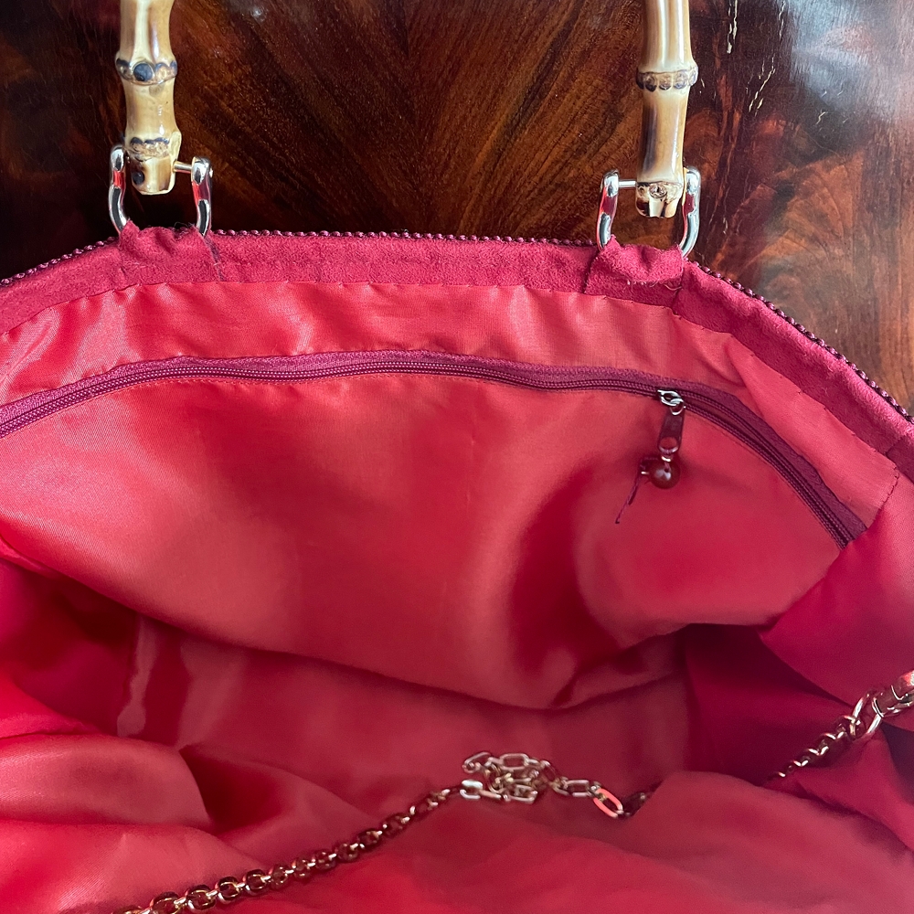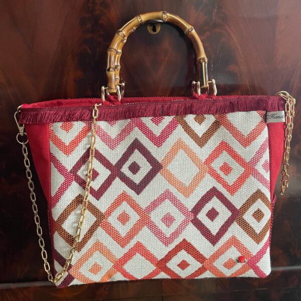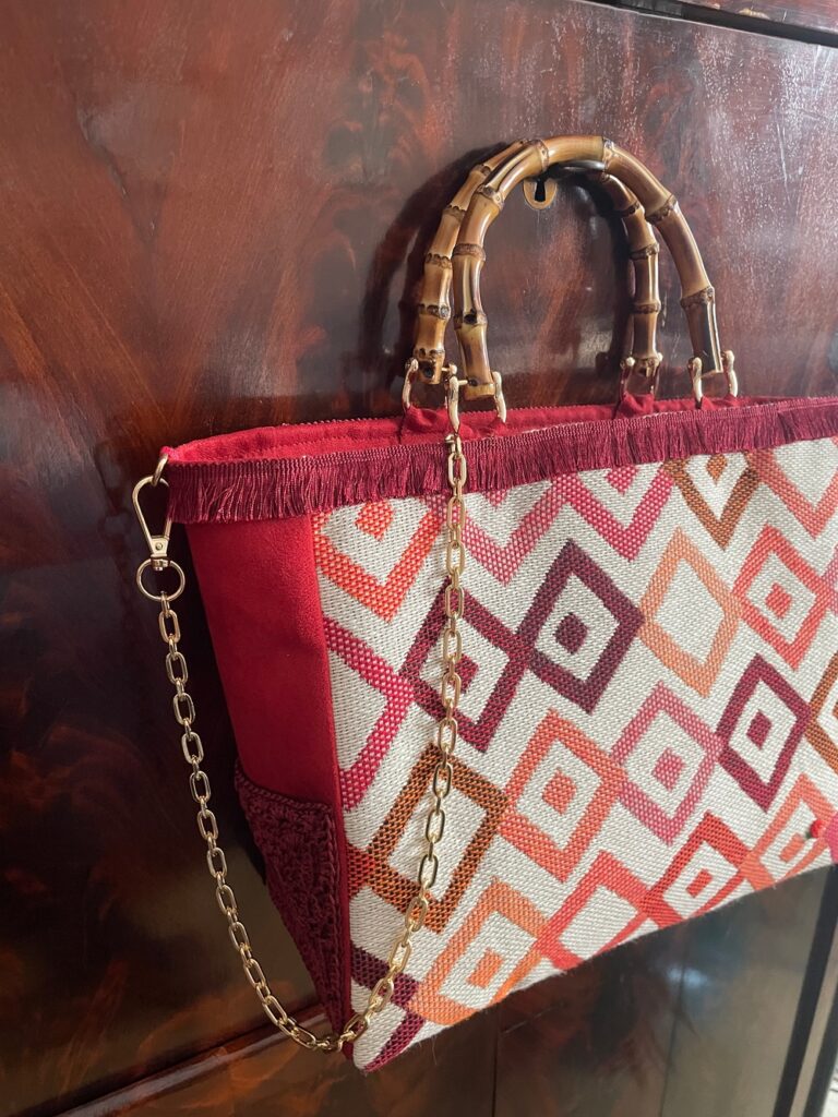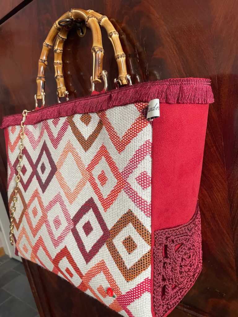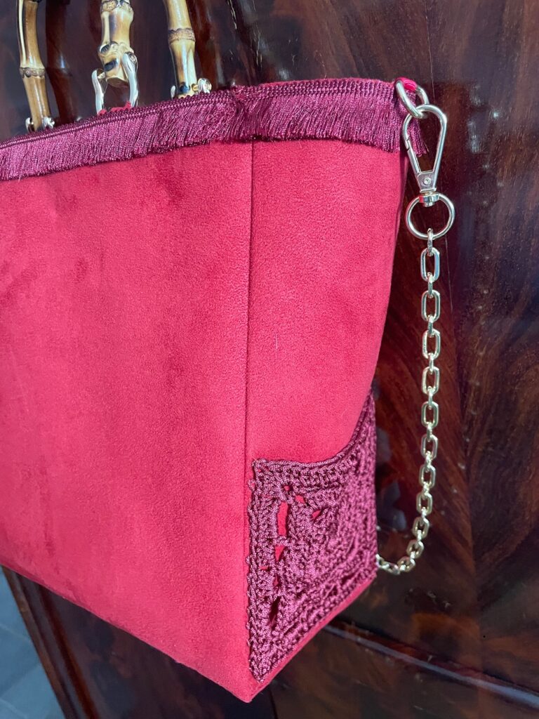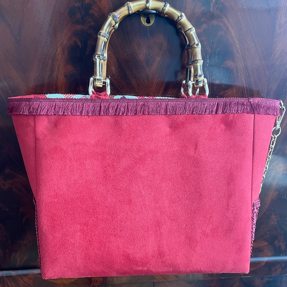 In tessuto operato in stile moderno, rifinitura con frangetta, laterale e retro in alcantara tinta unita, taschina in pizzo fatto a mano a uncinetto, manici in bambù, foderata con ampia tasca interna chiusa da cerniera.Piedini di sostegno sul fondo. Catenella di 1 mt. colore oro