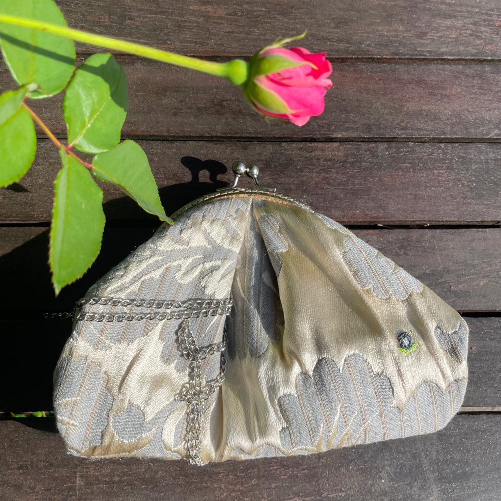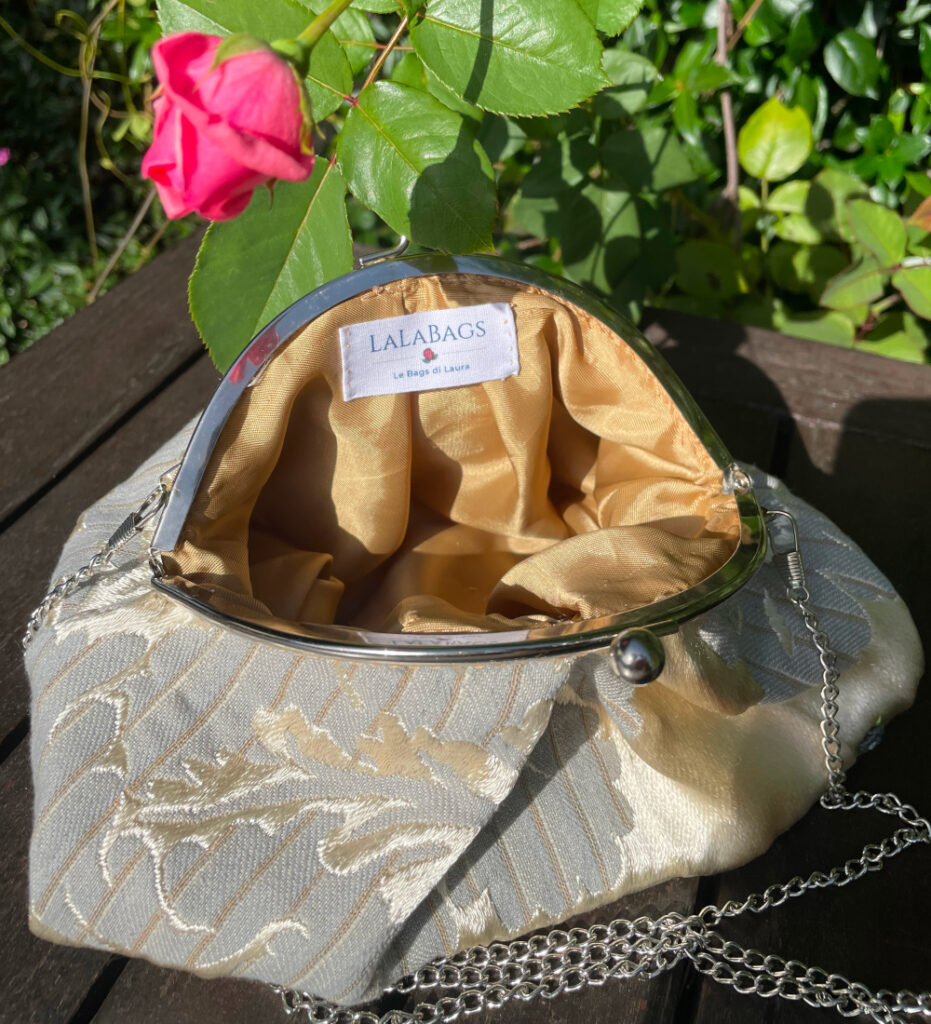 Piccola borsa a mano in tessuto operato, rifinita con fodera in tinta, si può portare con o senza catenella. Di misure contenute, elegante e dal colore facilmente abbinabile. La chiusura clic-clac è larga 15 cm.