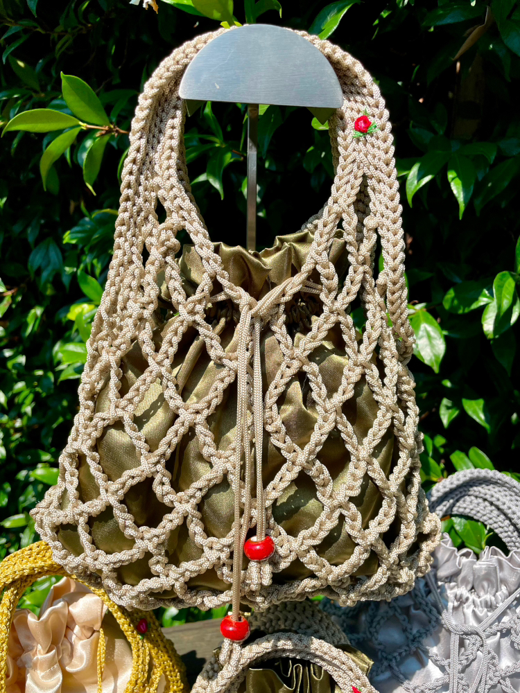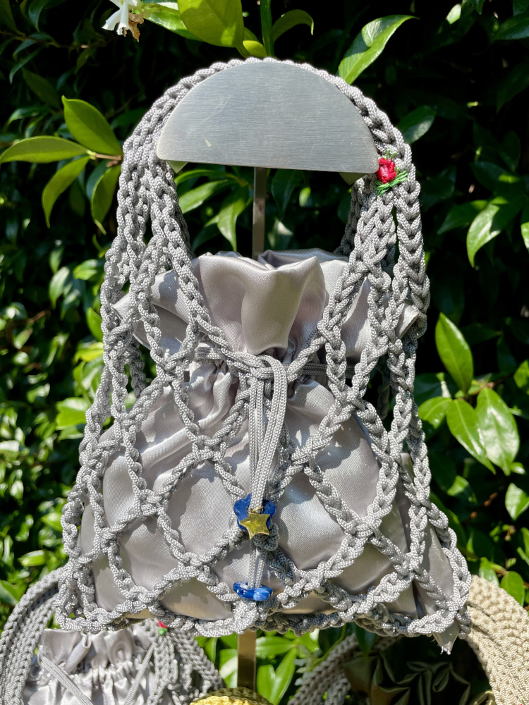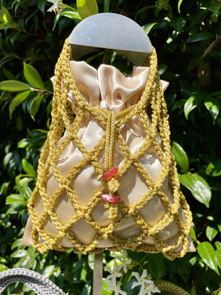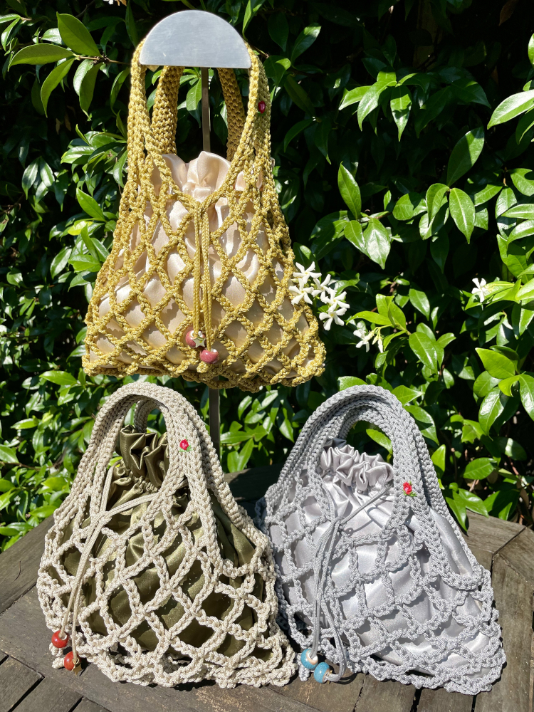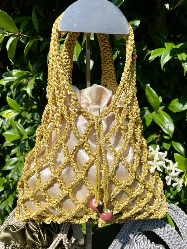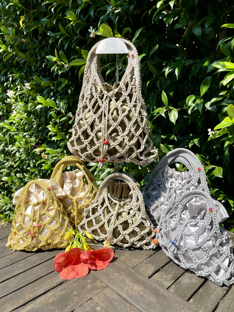 Clutch da portare al polso, rete realizzata a mano con uncinetto, ogni borsina contiene un sacchetto con laccetti in raso, colore in tinta o a contrasto. In due misure: le piccole, giovanili e ideali per una serata informale misurano circa  20 x 23 cm., le grandi, per un casual raffinato in ogni momento, misurano circa 28 x 30 cm. (manici compresi). In funzione della dimensione del filato le misure possono variare leggermente.