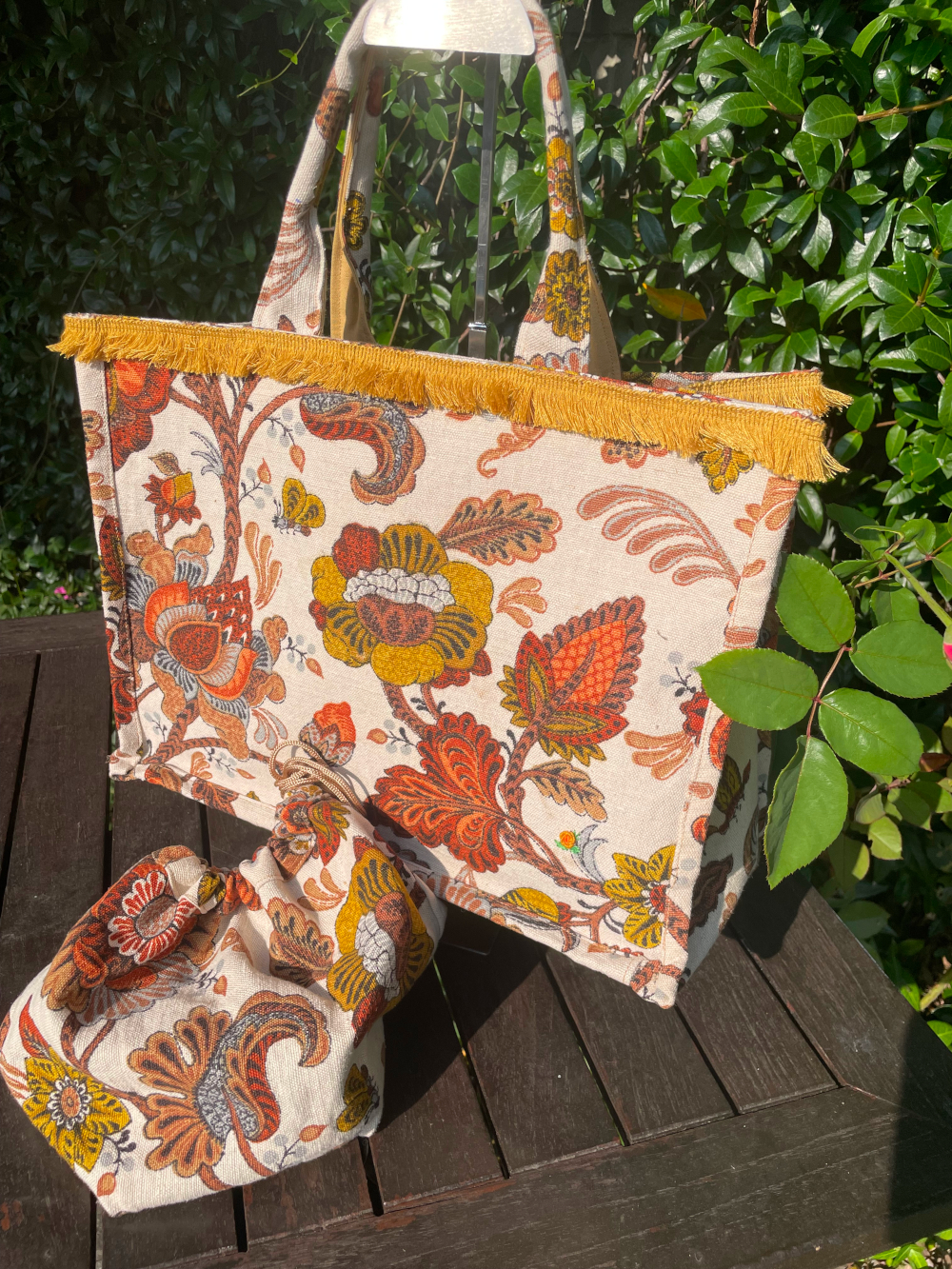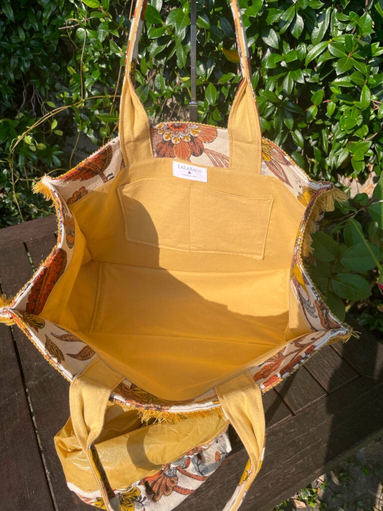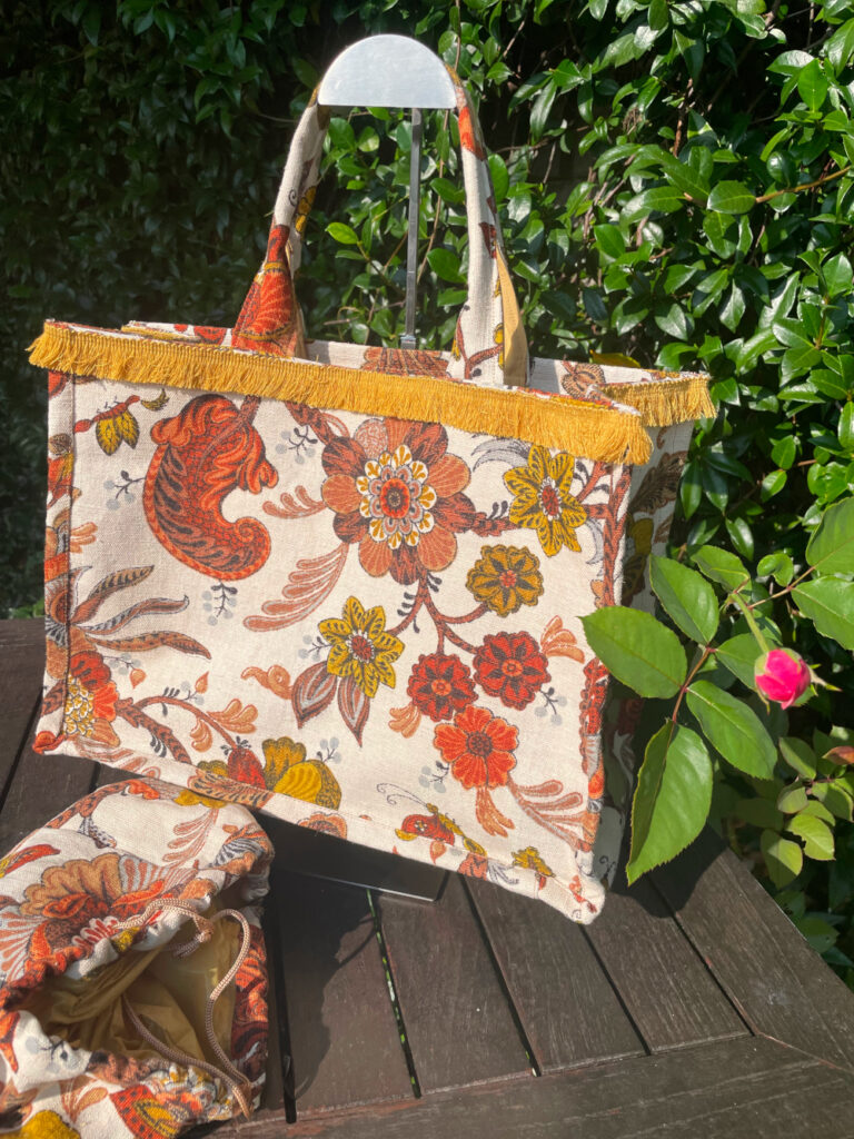 In tessuto grezzo a fantasia dai toni autunnali, ampia e comoda borsa da usare anche in città. Il sacchettino in tinta con tessuto interno impermeabile permette di trasportare il pranzo in sicurezza. Dotata di due piccole tasche, la fodera interna è aderente al tessuto esterno, leggermente rinforzato per creare rigidità alla borsa. La frangetta in tinta come rifinitura sul bordo superiore le dà un tocco glamour. Misura L35 cm. x H26 cm. e P15cm. I manici sono di 17 cm.